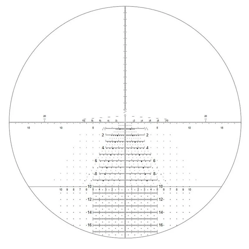 Das TReMoR3 Absehen in First Focal Plane (FFP) ist eines der fortschrittlichsten Absehen auf dem Markt. Es bietet zahlreiche Haltepunkte für Windkorrektur, Entfernungsmessung und Schussabgaben auf verschiedene Distanzen. Da das Absehen mit der Vergrößerung mitwächst, bleiben die Absehenpunkte bei jeder Vergrößerungsstufe proportional korrekt.